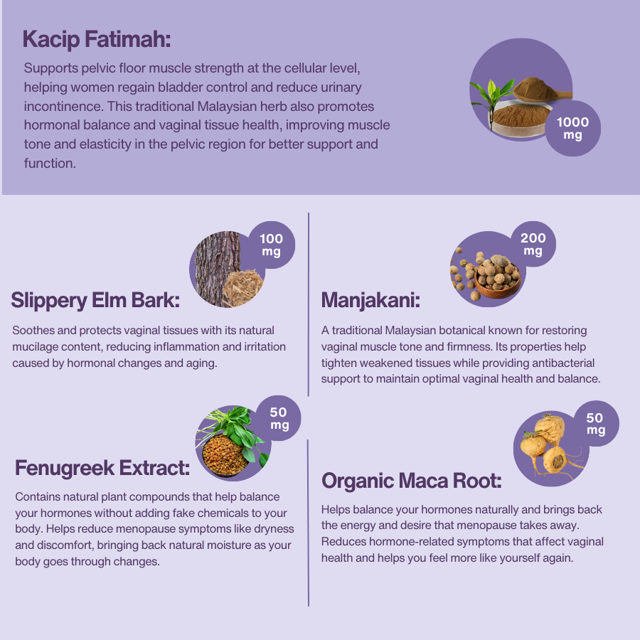 Estrogen loss after childbirth or menopause causes "urogenital atrophy" — the thinning of vaginal and bladder tissue that creates both dryness and leaking. They're not separate problems; they're the same hormonal damage. Pel-Fix's phytoestrogens from Kacip Fatimah and Fenugreek restore tissue thickness naturally, while Slippery Elm soothes and Maca Root rebalances sensation. You're not "too old" — your tissue just needs support Western medicine stopped providing. Rediscover intimacy without pain, moisture without products, and the vitality you thought was gone. This is restoration, not replacement.